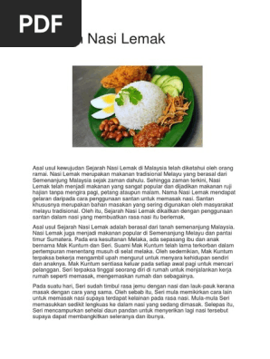 Nasi lemak juga menjadi makanan popular di semenanjung melayu dan pantai timur sumatera. Sejarah nasi lemak nama nasi lemak mendapat gelaran daripada penggunaan santan untuk memasak nasi. Buku karya sarjana inggris dan pakar malaya, sir richard olaf winstedt. Nasi lemak bajet based on puncak alam yo! Maka, mulailah ia mencari si babi untuk disembelih.