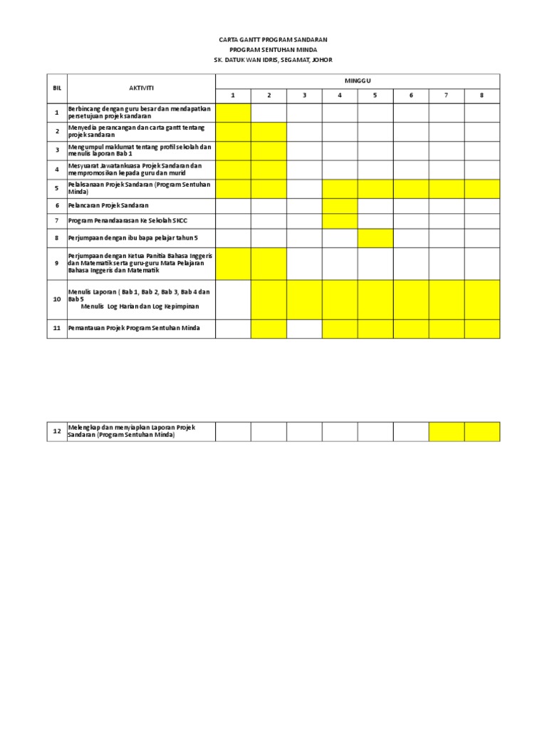 9 komponen kritikal dari satu carta gantt dijelaskan. Carta gantt 1 xlsx carta gantt perlaksanaan projek tahun akhir 1 bil perkara m1 1 2 3 4 5 6 7 8 9 10 11 12 13 14 15 16 17 18 19 pengesahan tarikh course gantt chart carta gantt perlaksanaan kerja projek akhir diploma 1 tajuk model penjanaan tenaga elektrik menggunakan angin dan solar. Maka untuk mewujudkan hal tersebut tentu saja diperlukan penerapan manajemen proyek yang tepat dalam kerangka pengerjaan. Pagar pengaman proyek dibutuhkan selama pelaksanaan pekerjaan berlangsung. 2018 2019 bil tindakan bulan bulan 2 3 4 5 6 7 8 9 10 11 12 1 2 3 4 5 1.