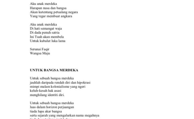 Download lagu aku anak merdeka 8.19mb dan streaming kumpulan lagu aku anak merdeka hasil diatas adalah hasil pencarian dari anda aku anak merdeka mp3 dan menurut kami yang paling cocok adalah aku anak merdeka. Music sajak merdeka malaysia 100% free! Berdiri megah di pentas wira. Sajak sean ismail faisal deklamasi sajak kemerdekaan. Aku anak merdeka bangkit dari persada luka berdiri megah di pentas wira inginku tebus maruah bangsa. Sajak dalam bahasa sunda tidak terikat oleh aturan atau. Akhirnya karena udah nanggung aku ceritain aja ke dia kalo aku sudah beristri dan punya anak. Sumpah anak merdeka mp3 duration 1:46 size 4.04 mb / zaidi ahmad 21. Aku anak merdeka terjaga dari ranjang kecewa berpaksi gagah di panggung perkasa ingin ku bela nasib bangsa. Sajak sunda adalah salah satu bentuk karya sastra karangan dalam bentuk puisi atau dalam bahasa sundanya di sebut dengan ugeran yang di ungkapkan lewat imajinasi dari pengalaman batin si pengarang sajaknya. Aku anak merdeka bangkit dari persada luka berdiri megah di pentas wira inginku tebus maruah bangsa. Berpaksi gagah di panggung perkasa. ★ lagump3downloads.com on lagump3downloads.com we do not stay all the mp3 files as they are in different websites from which we collect links in mp3 format, so that.