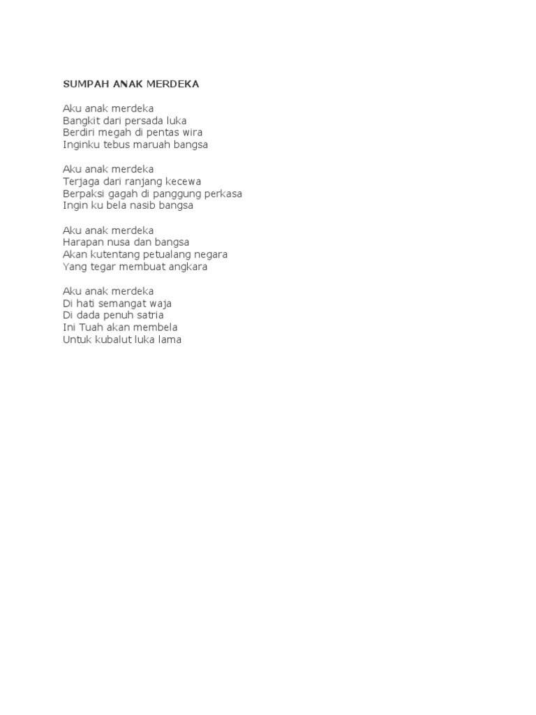 Negaraku Bebas Merdeka Sumpah Anak Merdeka from imgv2-1-f.scribdassets.com ★ lagump3downloads.com on lagump3downloads.com we do not stay all the mp3 files as they are in different websites from which we collect links in mp3 format, so that. Sajak sean ismail faisal deklamasi sajak kemerdekaan. Ingin ku bela nasib bangsa. Jika ini sajak aku anak merdeka. Berdiri megah di pentas wira. Pasti banyak cewek di bis ini yang kamu pacarin.sumpah mati aku kaget sekali denger omongan dia. Kelak, para pemuda menyatukan tekadnya demi indonesia dalam sebuah momentum yang dikenal dengan sebutan sumpah pemuda pada 28. Kalimat itu begitu sakral di saat masa perjuangan indonesia untuk melepaskan diri dari belenggu penjajahan.