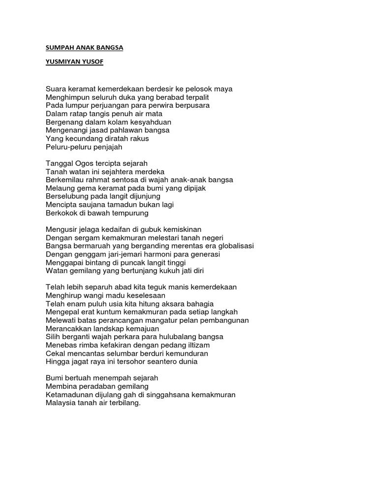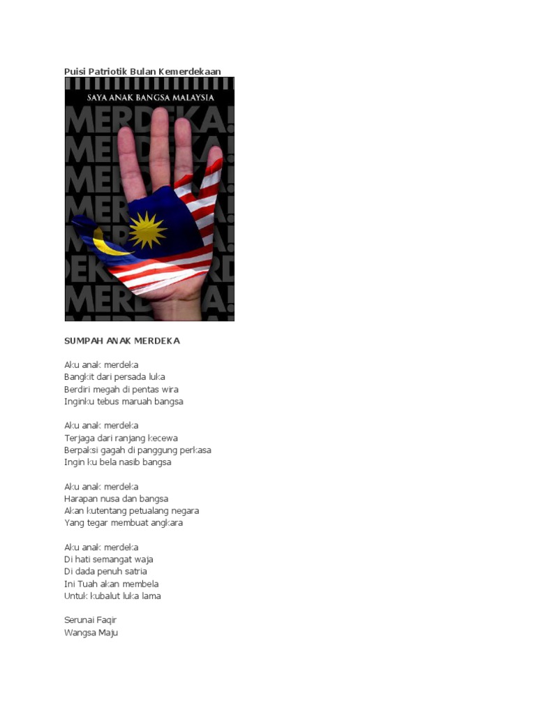 Savesave sajak sumpah anak merdeka for later. Aku anak merdeka, terjaga dari ranjang kecewa, berpaksi gagah di panggung perkasa, ingin ku bela nasib nyatakan maksud sajak sumpah anak merdeka mengikut rangkap demi rangkap. sajak sumpah anak merdeka aku anak merdeka bangkit dari persada luka berdiri megah di pentas wira inginku tebus maruah bangsa aku anak merdeka terjaga dari ranjang kecewa berpaksi gagah di panggung perkasa ingin ku bela nasib bangsa aku anak merdeka harapan nusa dan. Berikut sajak karya affrini adham dalam sajaknya yang berjudul malaya pasti merdeka. Aku anak merdeka terjaga dari ranjang kecewa berpaksi gagah di panggung perkasa ingin ku bela nasib bangsa.