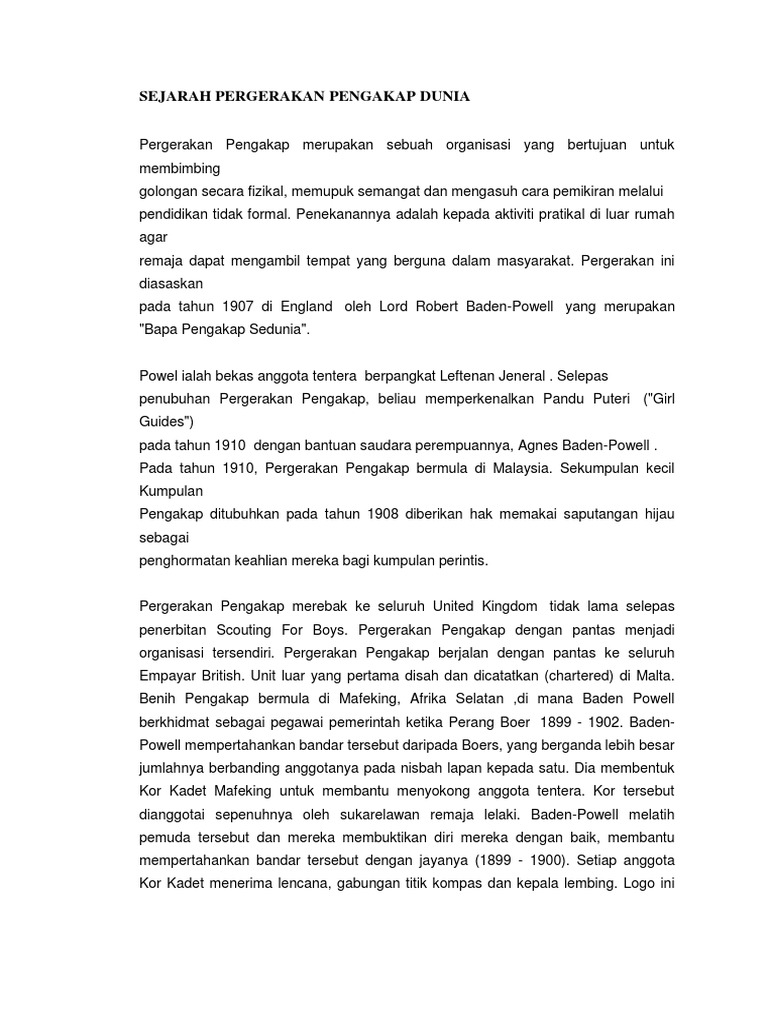 Sejarah Pengakap Dunia Pdf Free Download from docplayer.info Kini kita telah menyambut ulang tahun ke 100 pergerakan pengakap. Malaysia rencananya terbentuk dari persekutuan tanah melayu, singapura, sarawak, brunei, dan sabah. Persekutuan pengakap malaysia, ringkasnya ppm ialah suatu pertubuhan beruniform sukarela untuk para beliawan dan beliawanis. Pada harini merupakan hari pembentangan projek bagi projek komuniti yang telah berjaya di siapkan oleh pengakap kelana negeri kelantan pada tahun ini. Akta persekutuan pengakap malaysia (pemerbadanan) 1968. Dicatat oleh pengakap di 1:58 pg tiada ulasan Sejarah pengakap dunia bermula pada tahun 1907 di pulau brownsea, england. Bermula di pantai barat malaysia dalam tahun 1910, dua tahun selepas ianya dimulakan di great britain.