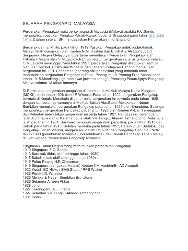Related : Sejarah Pengakap Di Malaysia : Pergerakan pengakap di malaysia bermula pada tahun 1910 di singapura dimana pengasasnya adalah f.c sands seorang peneroka british..